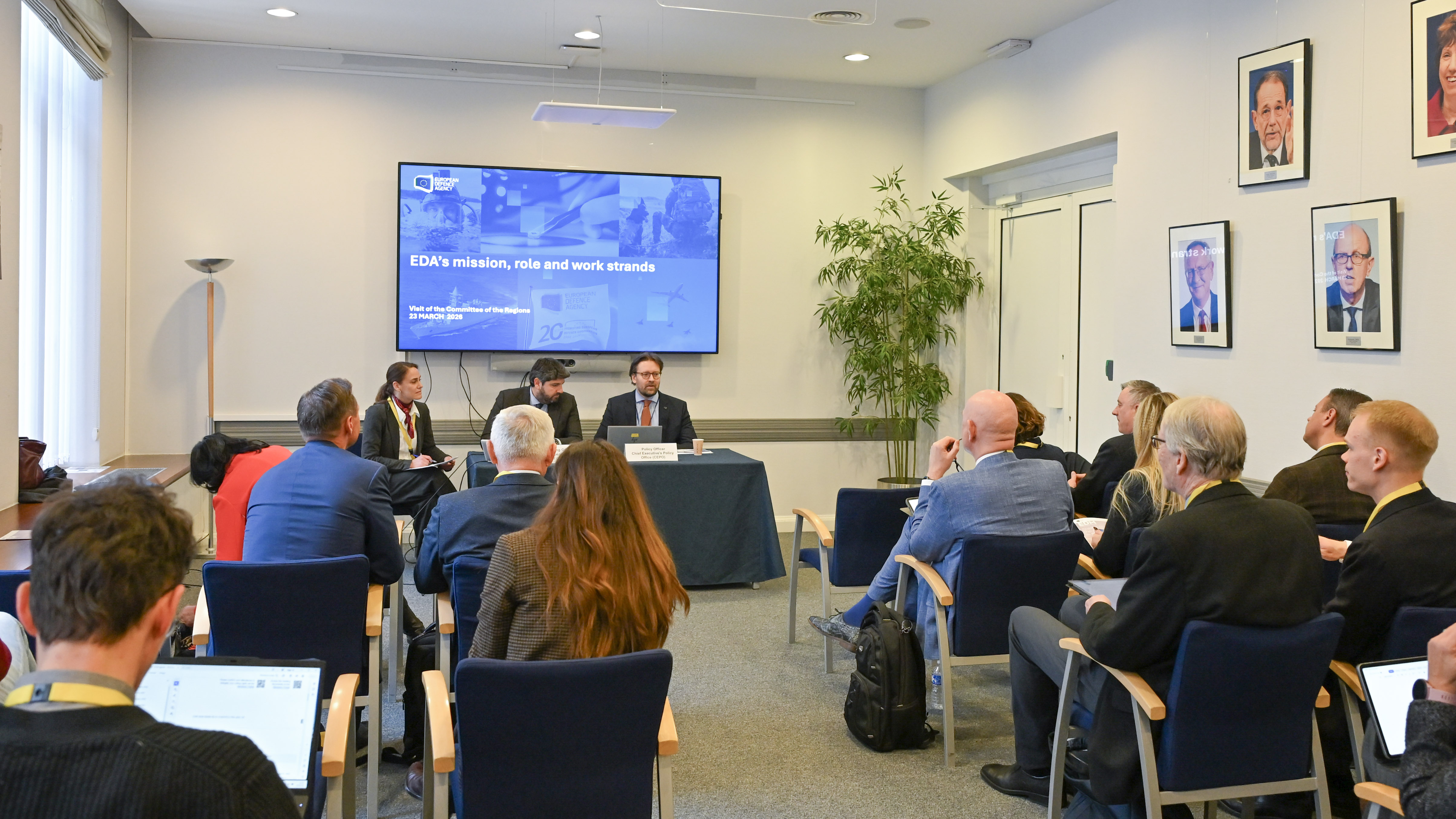 Fernando López Miras, Chairman of the Working Group on Defence of the European Committee of the Regions, together with a delegation representing 10 European regions, visited the European Defence Agency (EDA) on Monday, 23 March 2026, and was briefed by EDA officials.