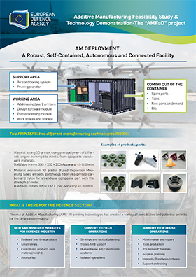 Additive Manufacturing (AM) technologies have been identified as one of the key enabling technologies to improve European industrial competitiveness given its ability of rapid, delocalised and flexible manufacturing. They are considered to empower the transition from mass production to mass customization in several leading sectors, including, among others, automotive, medical, aeronautics, energy and consumer goods. The defence sector, however, is not exploiting yet the full potential offered by AM technologies.