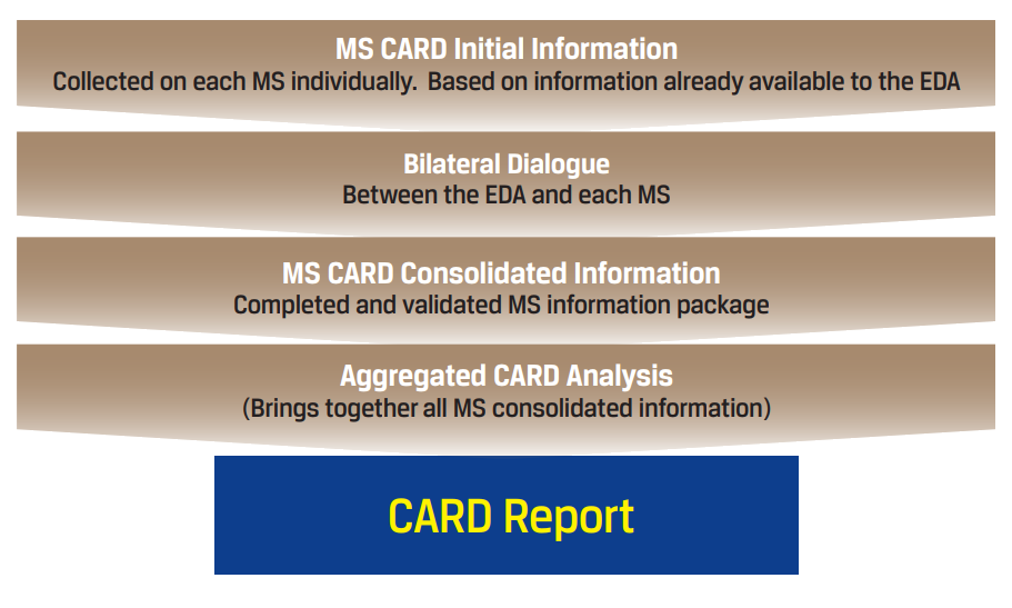 The EDA will make extensive use of existing information sources – the Agency will first analyse information already available in EDA databases and Member States’ replies to the EU Military Capability Questionnaire, or any other information Member States’ are willing to provide to the EDA. A “Member State CARD Initial Information” document will be produced by the EDA and sent to each individual Member State. This will provide the basis for bilateral discussions in capitals during which members of the EDA CARD team will meet with the Member States’ designated representatives to validate and supplement the information collected. A second, no less important part of the bilateral dialogue will focus on opportunities for cooperative capability development.